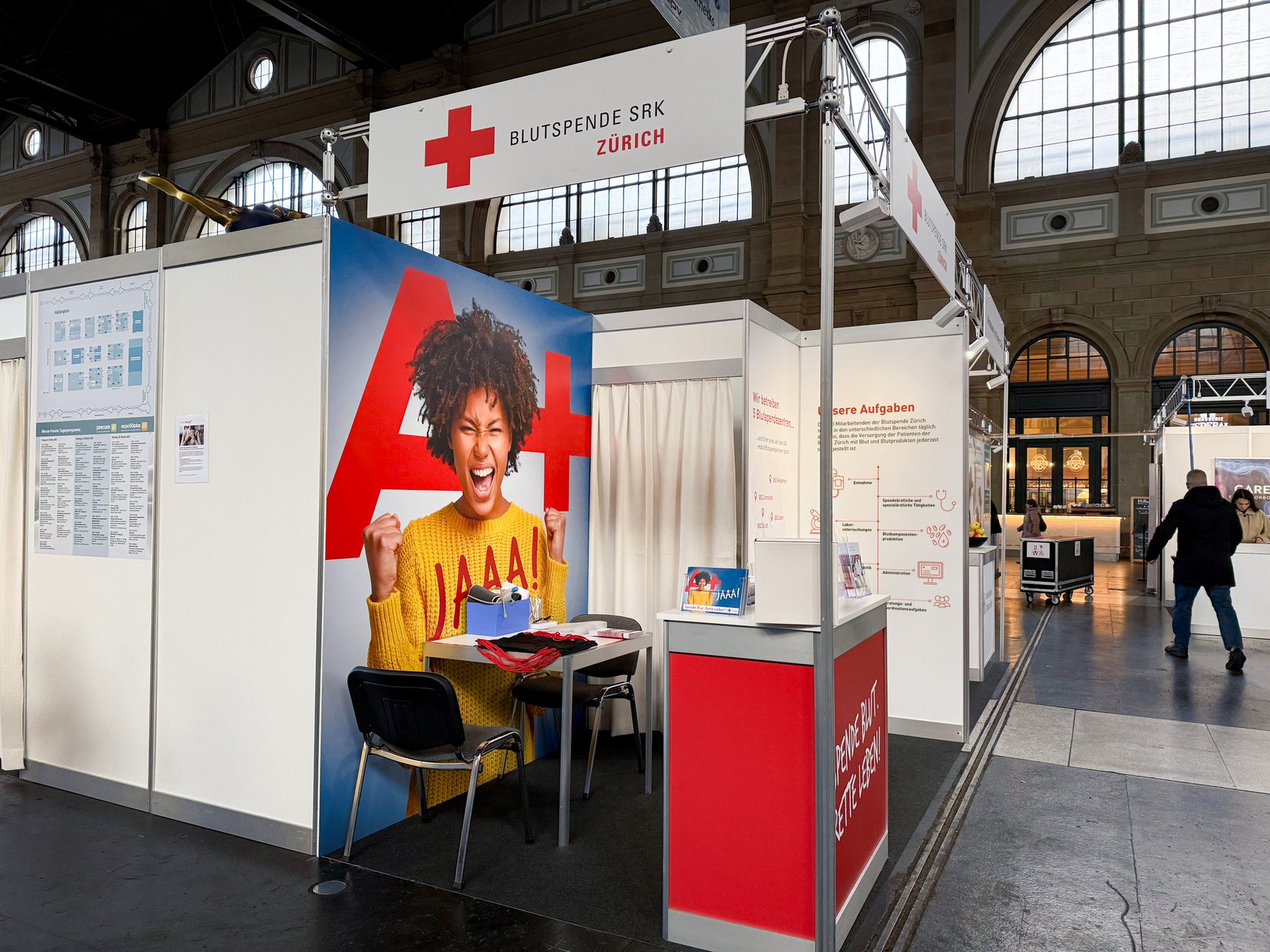 Vom 24. bis 26. Oktober 2025 war die Blutspende Zürich erneut mit einem eigenen Stand an der precura, der Präventionsmesse im Zürcher Hauptbahnhof, vertreten. Unter dem Motto «Das Richtige tun, das Falsche lassen = Mehr Lebensfreude» drehte sich alles um Gesundheitsförderung und Prävention. Der Stand der Blutspende Zürich stiess auf grosses Interesse: Viele Passantinnen und Passanten nutzten die Gelegenheit, sich über Blutspende zu informieren, Fragen zu stellen und mehr über die Bedeutung freiwilliger Spenden zu erfahren.